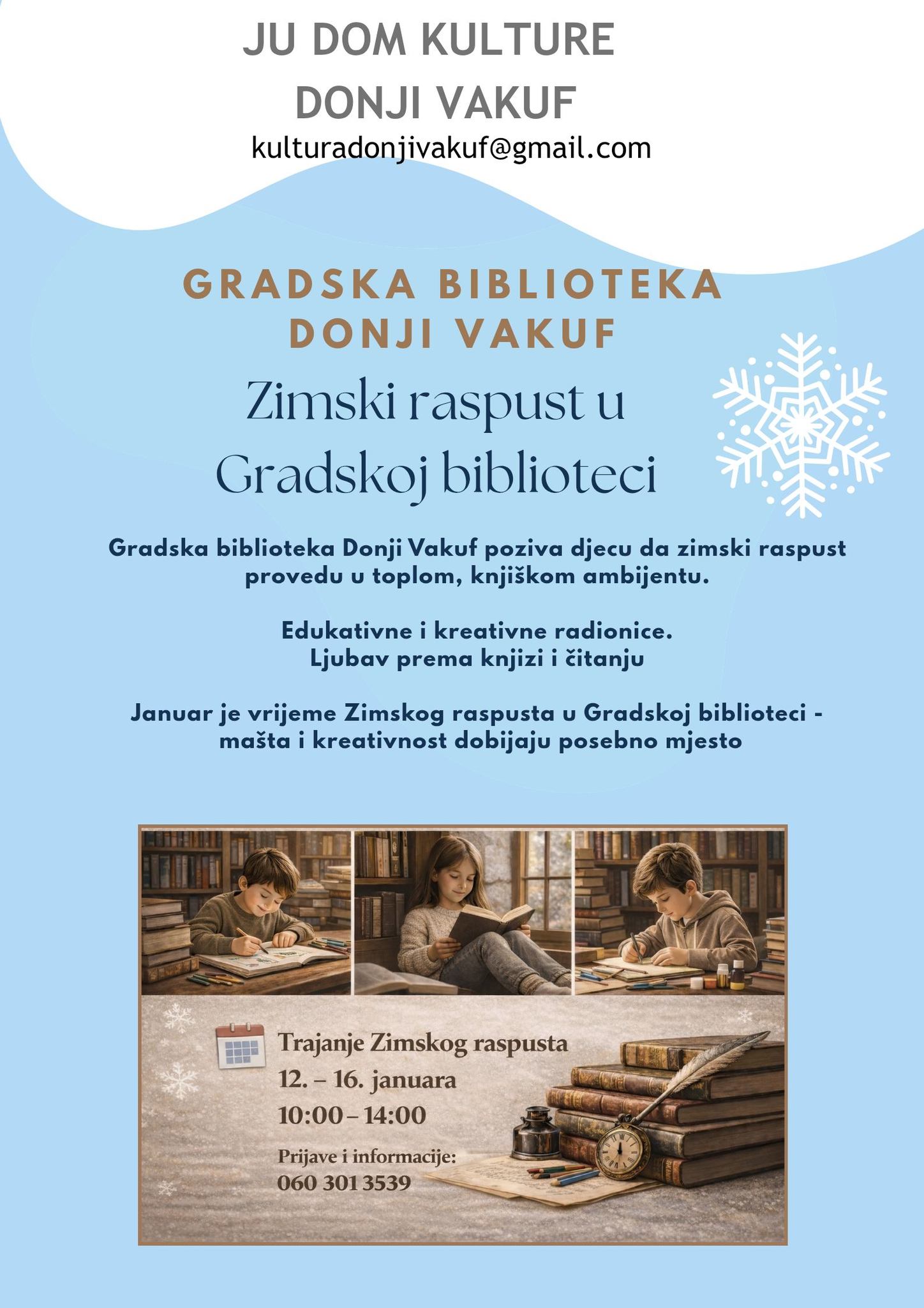 U okviru Zimske čarolije JU Dom kulture Donji Vakuf i Gradska biblioteka organizuju ” Zimski raspust u Gradskoj biblioteci”. Ovom prilikom pozivaju se djeca da raspust provedu u toplom družeći se sa knjigom, lijepim štivima i pričama. Zimski raspust počinje, 12. januara i traje do 16. januara, u vremenskom terminu od 10.00 do 14.00 sati.